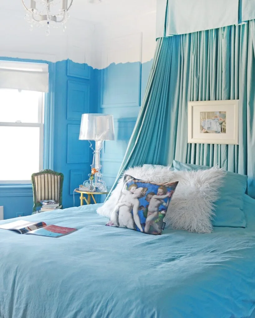 This bedroom showcases a daring use of blue, blending vivid walls, drapery, and bedding into a striking monochromatic design.