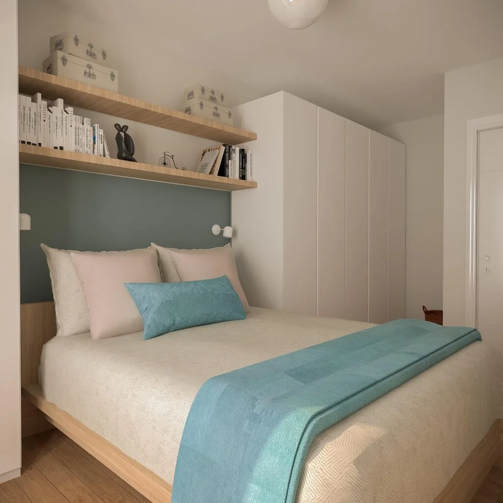 This bedroom combines light neutrals with teal details, creating a refreshing yet balanced space perfect for smaller interiors.