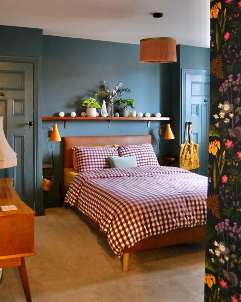 A caramel-colored bed frame pairs with burgundy gingham bedding, adding playful texture and vintage charm. Mustard accents and orange wall sconces brighten the palette, balancing the darker backdrop.