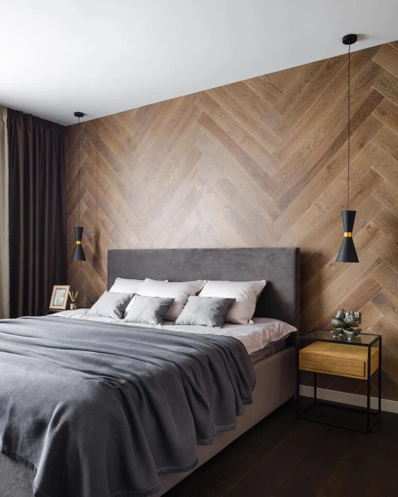 The herringbone wood-paneled wall creates texture and depth, serving as a bold focal point behind the bed. Charcoal bedding and an upholstered headboard add sophistication, softened by light gray pillows and crisp white sheets.