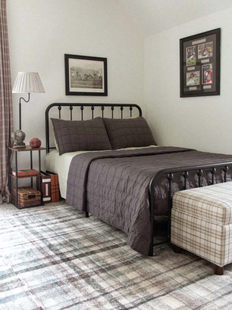 The black metal bed frame introduces vintage character, while dark brown bedding contrasts against light walls for depth. Plaid curtains and an ottoman echo the patterned rug, tying the space together with cohesive texture.