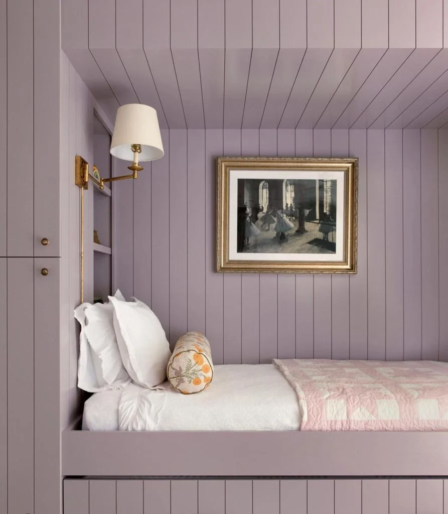 This bedroom uses soft lavender walls and cabinetry to create a cocoon-like atmosphere, offering serenity and charm.