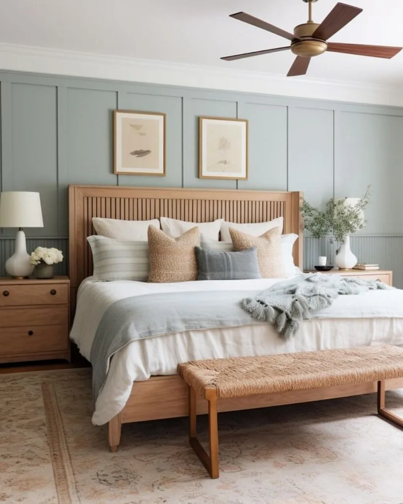 The warm wooden bed frame and nightstands balance the cool-toned walls, while neutral bedding adds softness and comfort. Layered pillows in beige, gray, and soft blue bring depth without overpowering the palette.
