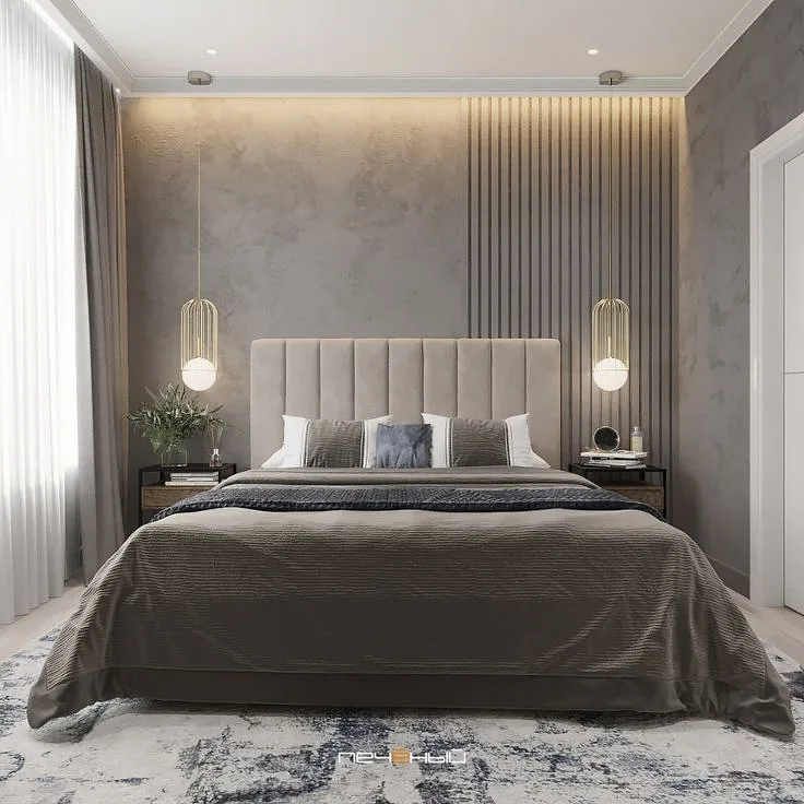 This bedroom highlights a sleek gray palette, softened by layered textures and warm lighting for a refined modern look.