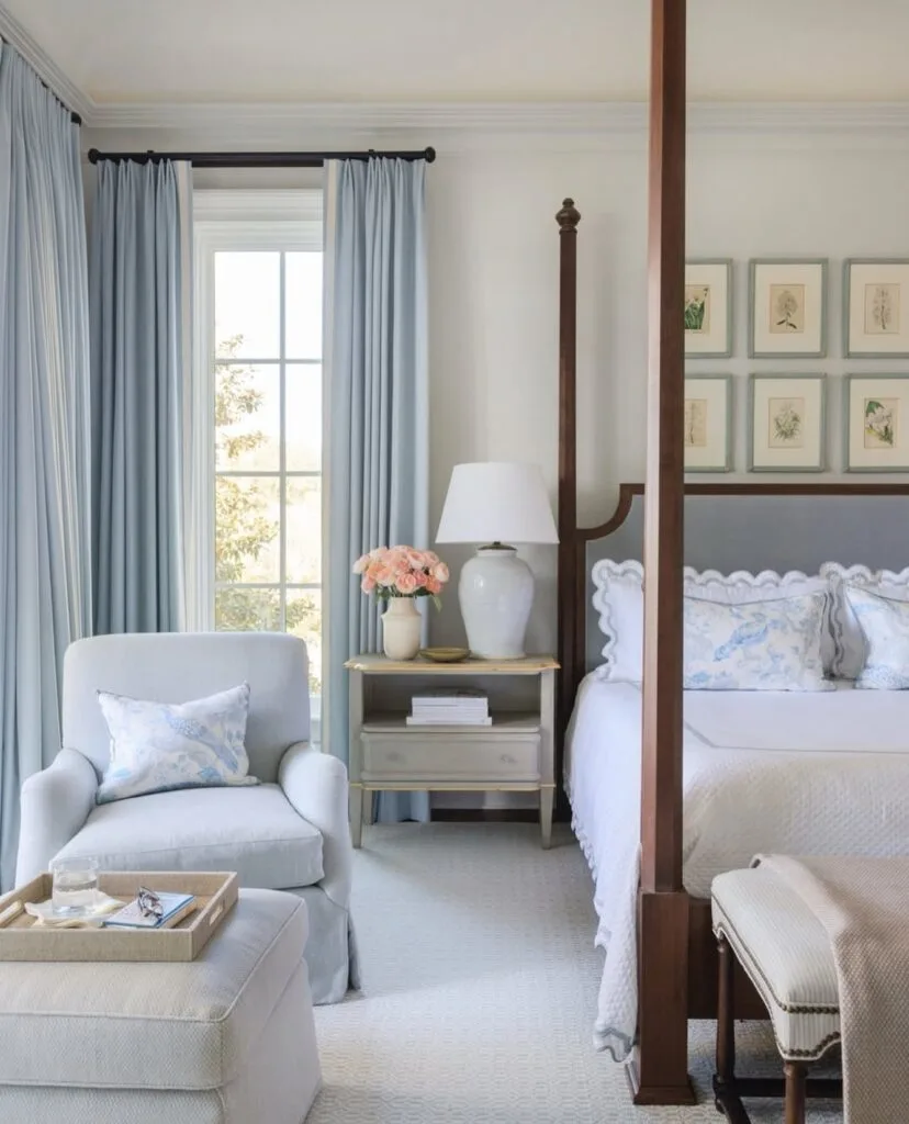 This bedroom uses soft blue drapery, upholstery, and accents to create a calm, restful retreat.