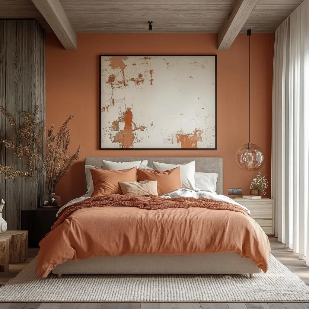 This bedroom embraces terracotta tones, pairing earthy walls and bedding with soft neutrals for a balanced, inviting retreat.