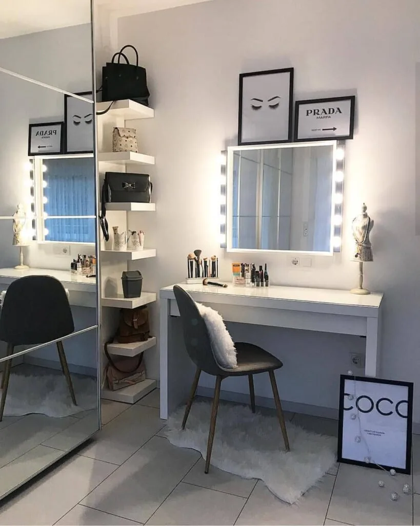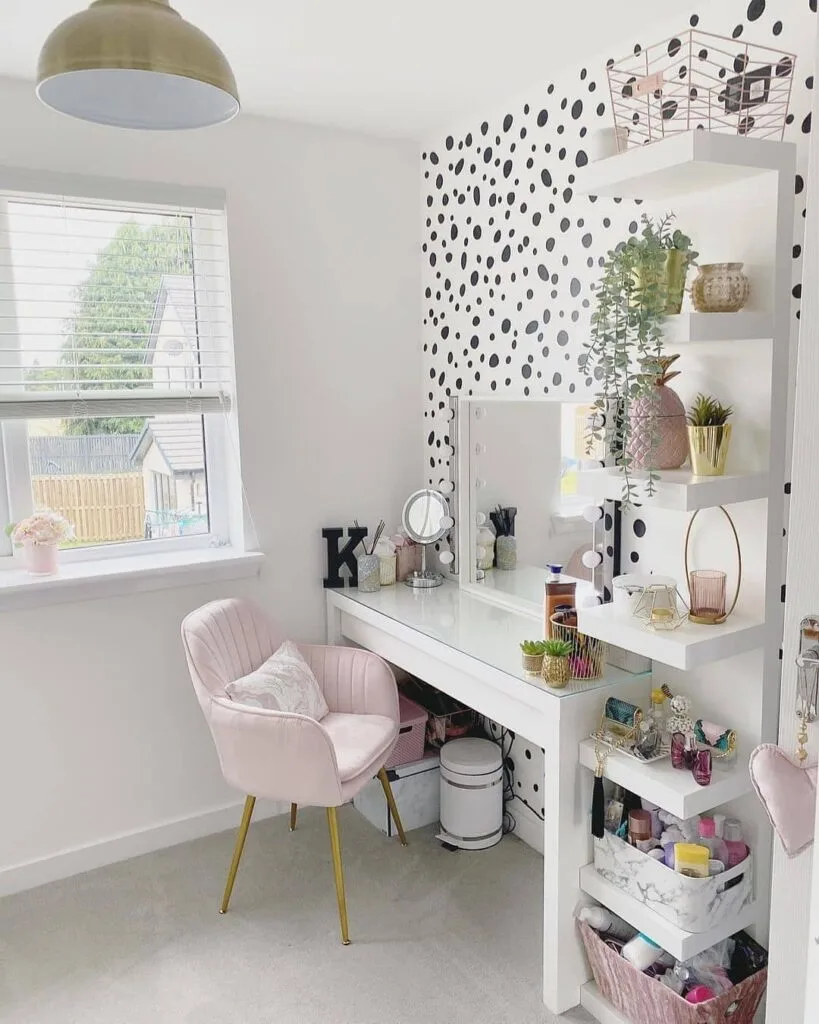 This bedroom vanity design perfectly combines style with organization, creating a bright and inviting beauty corner.