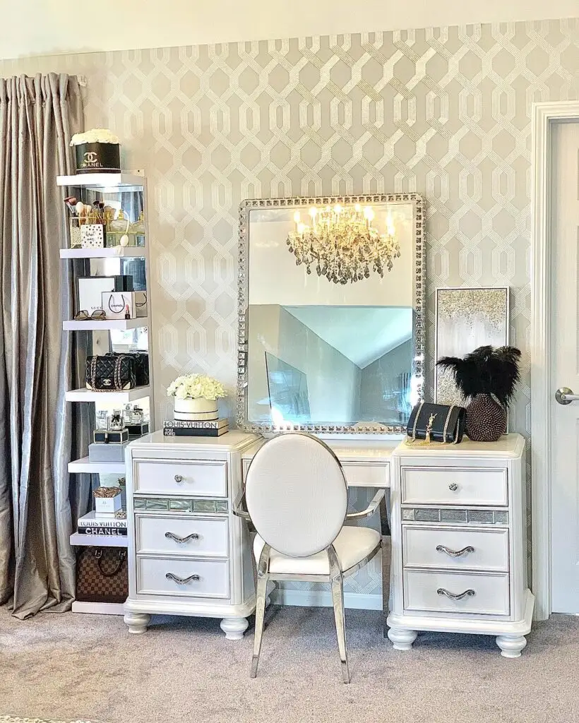 The Hollywood-style mirror framed with bright bulbs provides excellent lighting while giving the space a glamorous aura. A tufted silver bench with studded accents pairs beautifully with the mirrored desk, enhancing the luxe feel.
