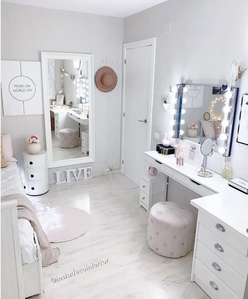 The Hollywood-style mirror framed with lights adds a glamorous flair, perfect for flawless makeup application. Soft pink accents, from the tufted ottoman to delicate flowers, enhance the airy aesthetic.