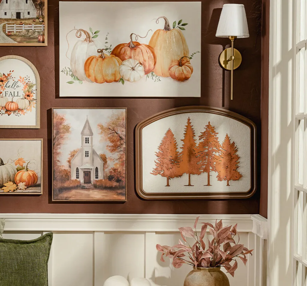 This cozy fall gallery wall combines seasonal art with warm, inviting tones. Pumpkin prints, autumn landscapes, and tree silhouettes come together to celebrate the beauty of the season.