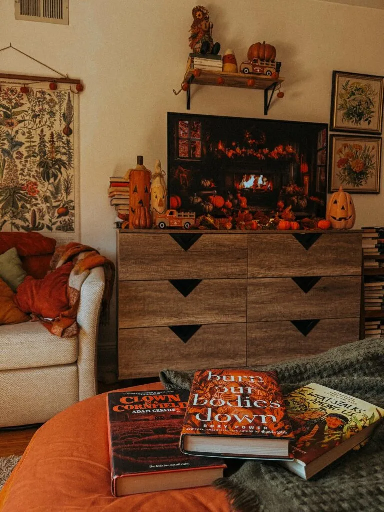 A dresser topped with pumpkins, candles, and festive accents creates a warm backdrop, enhanced by a television displaying a glowing autumn fireplace. Nearby shelves and wall art add vintage charm, while soft throws and pillows make the space extra comfortable.