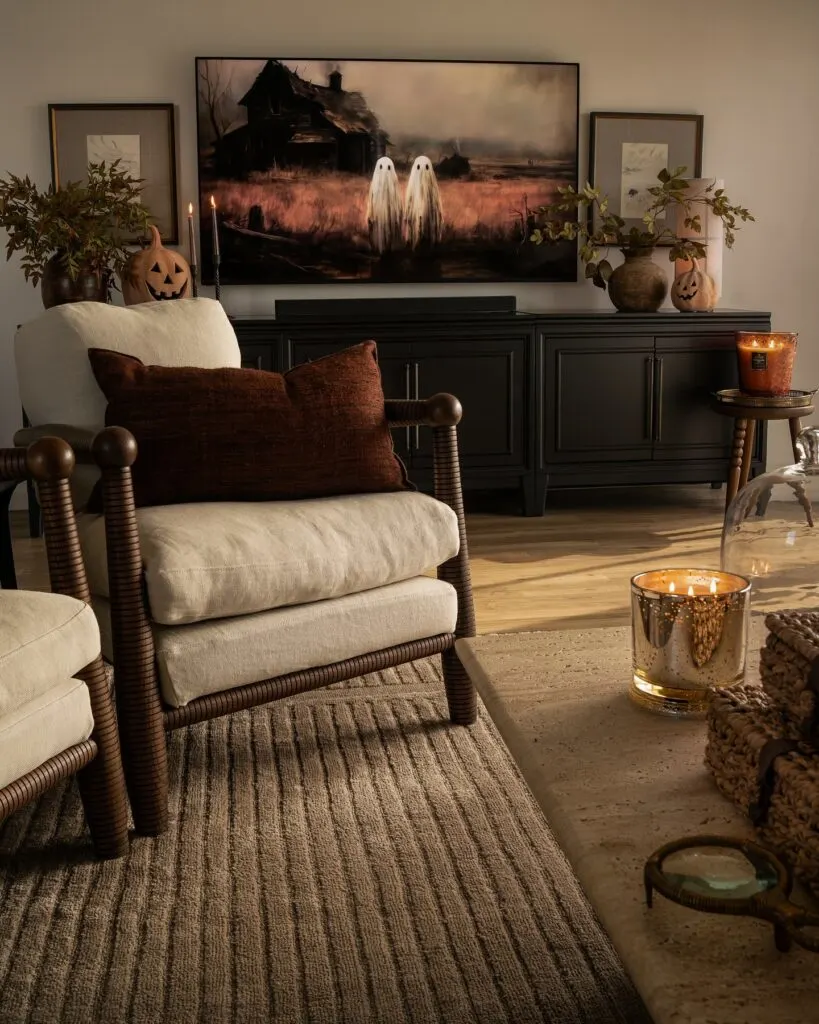 This warm living room combines comfort with understated Halloween style for a balanced seasonal look. Neutral furniture and soft textiles create a cozy foundation, enhanced by earthy autumn tones.