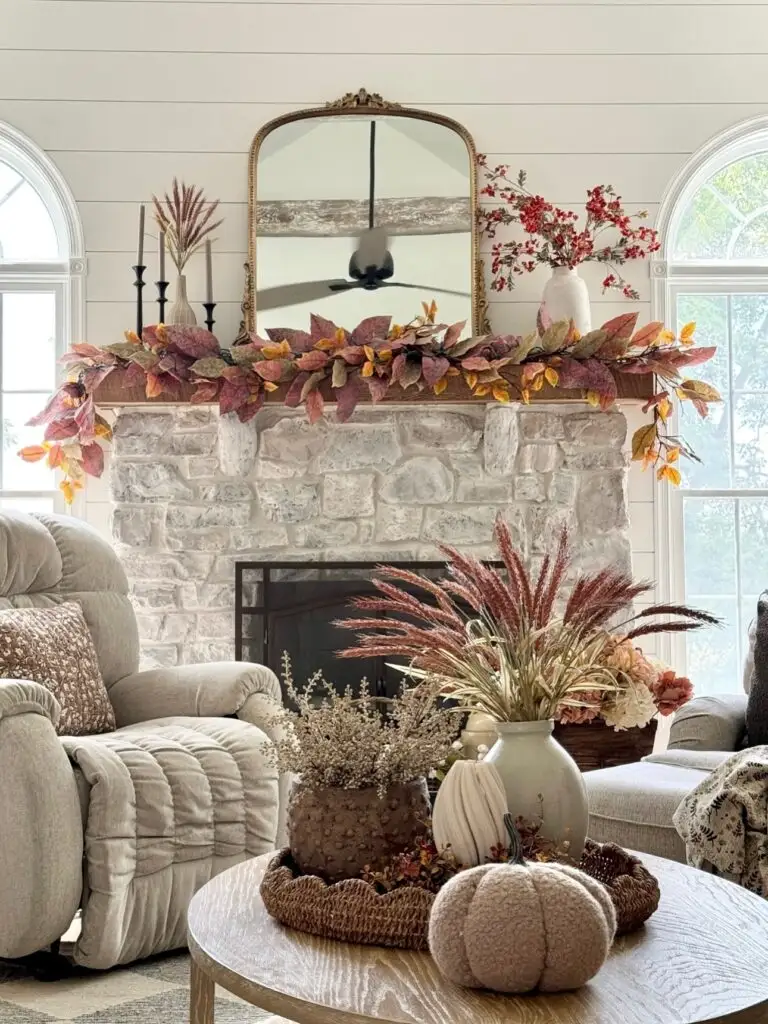 This living room creates a warm seasonal atmosphere with layered autumn touches. A stone fireplace serves as the centerpiece, topped with a garland of red, orange, and gold leaves.