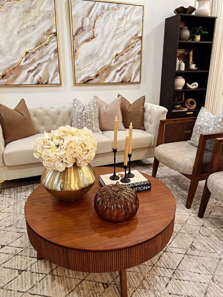 Abstract wall art with gold accents ties the look together, elevating the space with subtle glamour. The combination of earthy textures and modern design captures fall’s elegance in a stylish, inviting way.