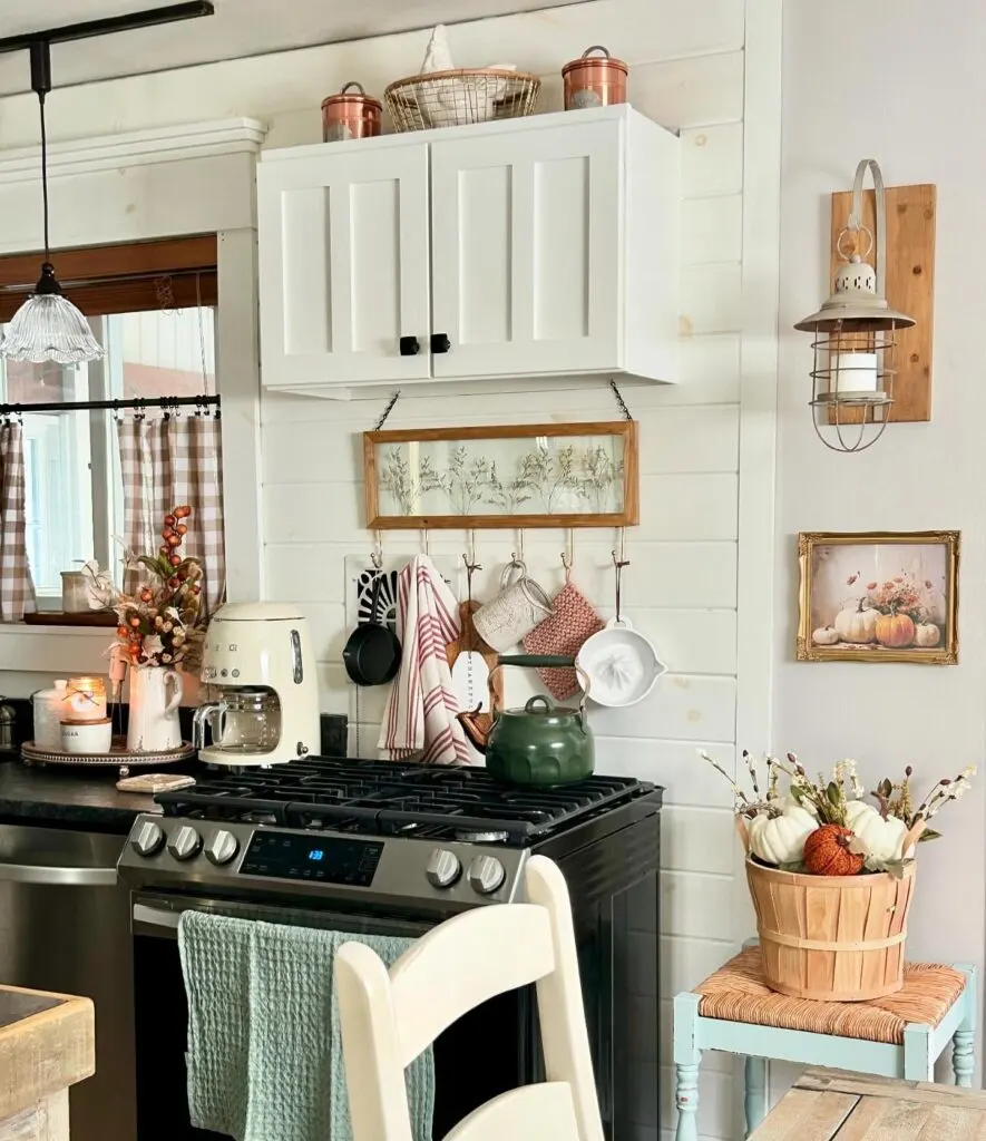 Combined with checkered curtains and farmhouse touches, the kitchen feels inviting, homey, and perfectly ready for fall gatherings.