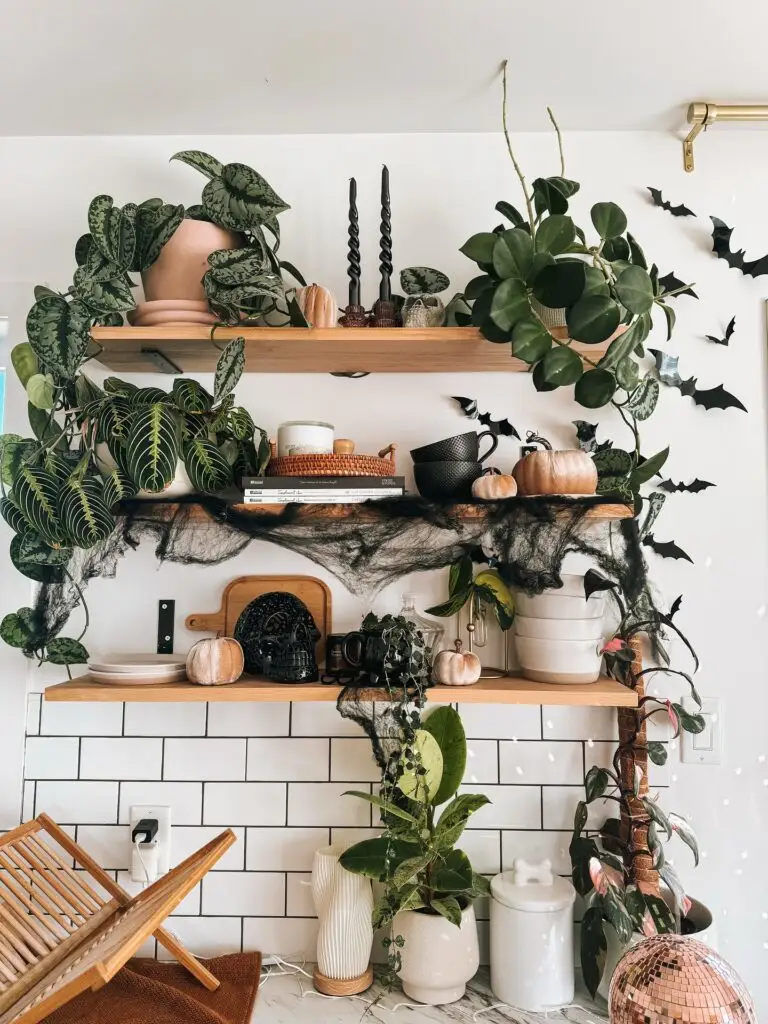 Flying bat cutouts on the wall extend the theme, creating movement and depth. Everyday items like books and dishes blend seamlessly into the arrangement, making the shelves feel festive yet functional for the season.
