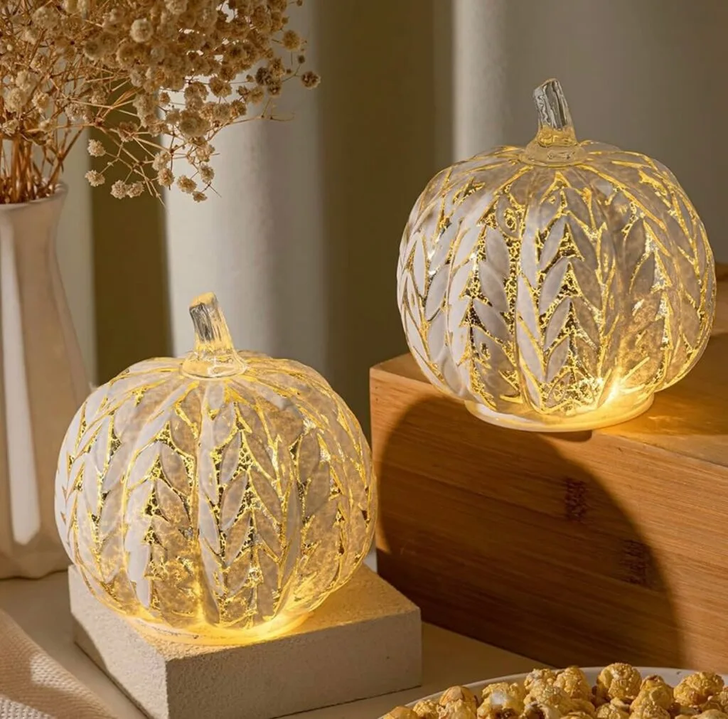 These illuminated glass pumpkins bring a soft, enchanting glow to fall decor. Their delicate etched patterns reflect light beautifully, creating warmth and sophistication.