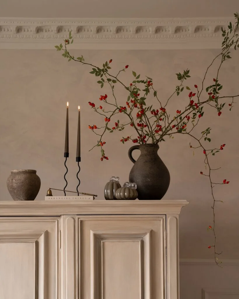 Small decorative pumpkins and a rustic clay pot balance the display with subtle fall details. Set atop a cream cabinet, this minimalist design captures autumn’s charm while maintaining a refined and understated style.