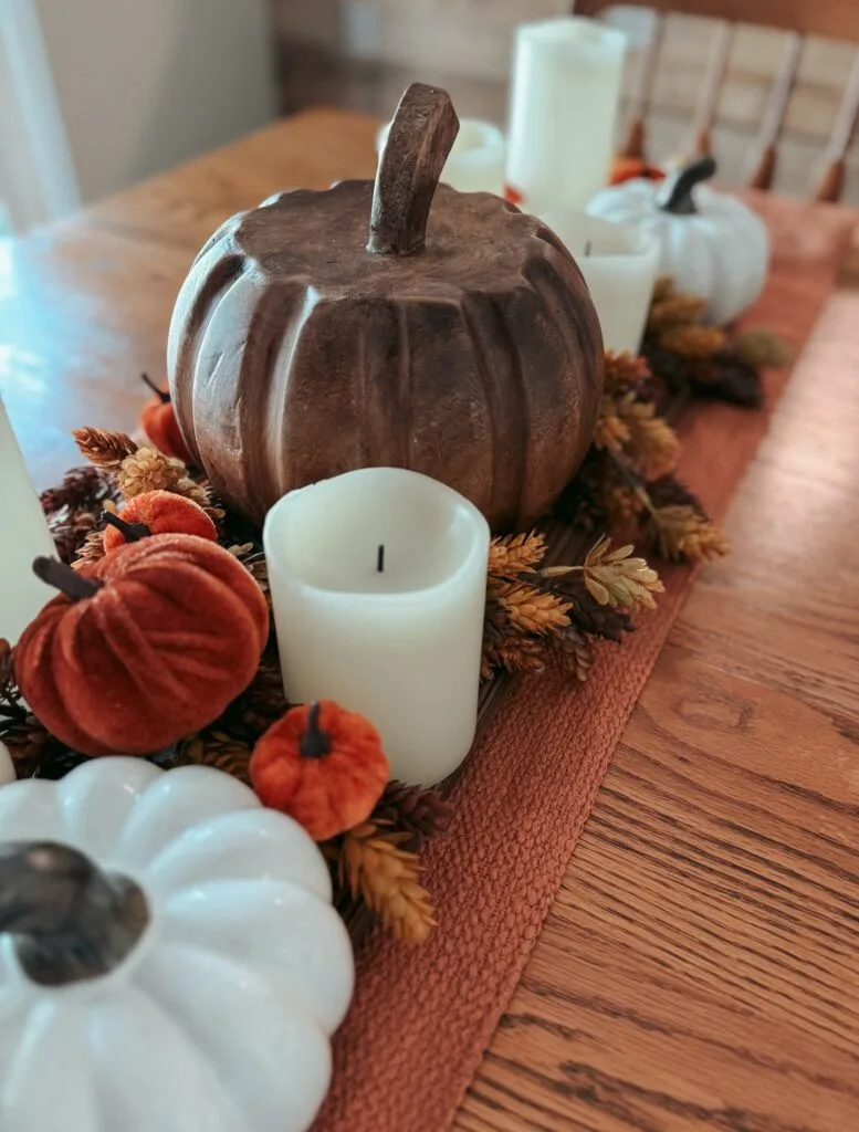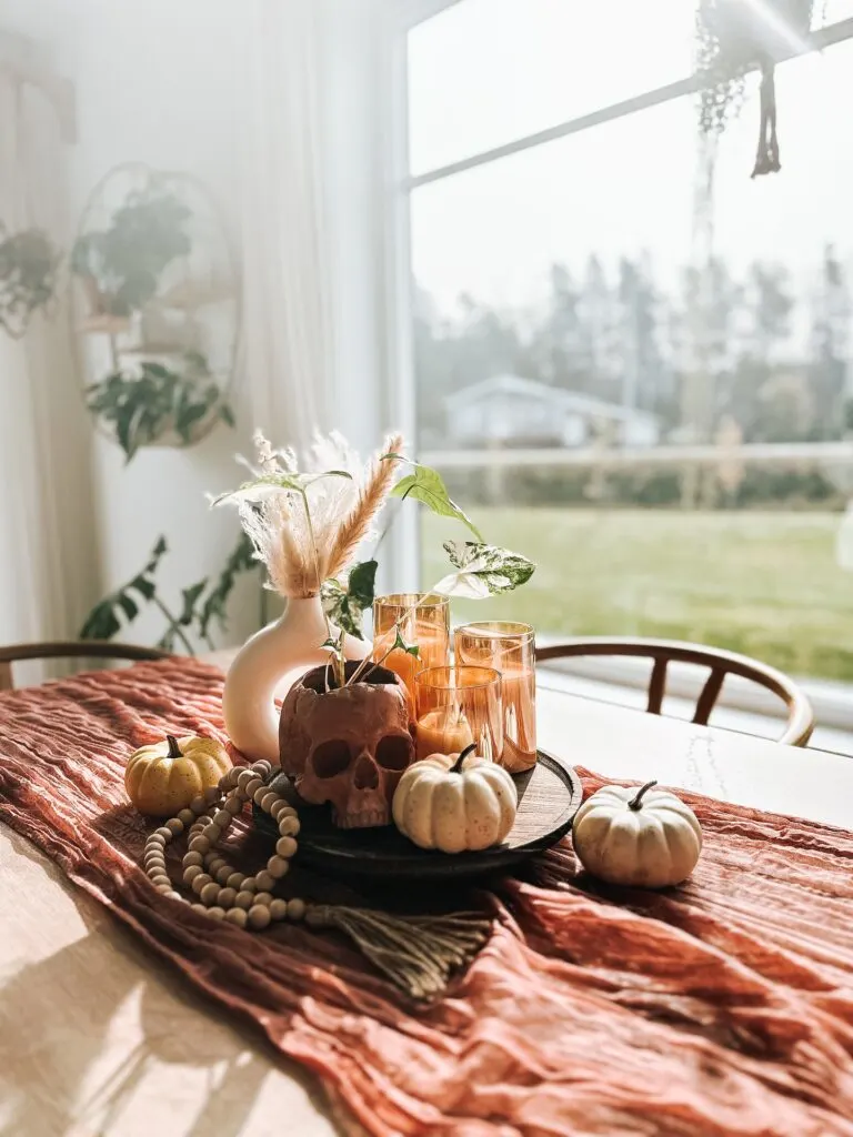 This fall tablescape combines rustic elegance with a hint of spooky charm. A textured rust-colored runner sets the foundation, bringing warmth and richness to the table.