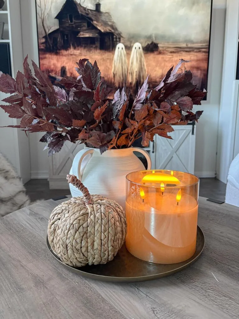 This tabletop fall display captures the season’s charm with a mix of texture and soft light. A woven pumpkin introduces rustic appeal, while a large orange candle glows warmly in its glass holder.