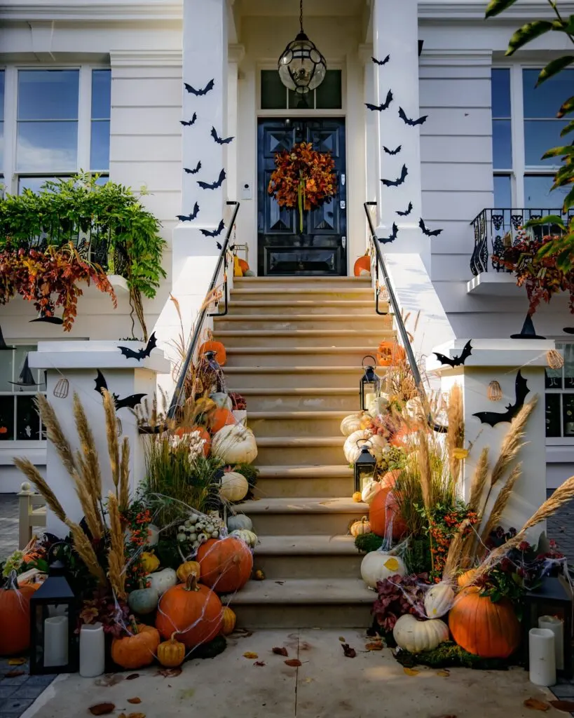 This striking Halloween porch design transforms the staircase into a bold seasonal display. A mix of orange and white pumpkins lines the steps, paired with tall pampas grass for texture.