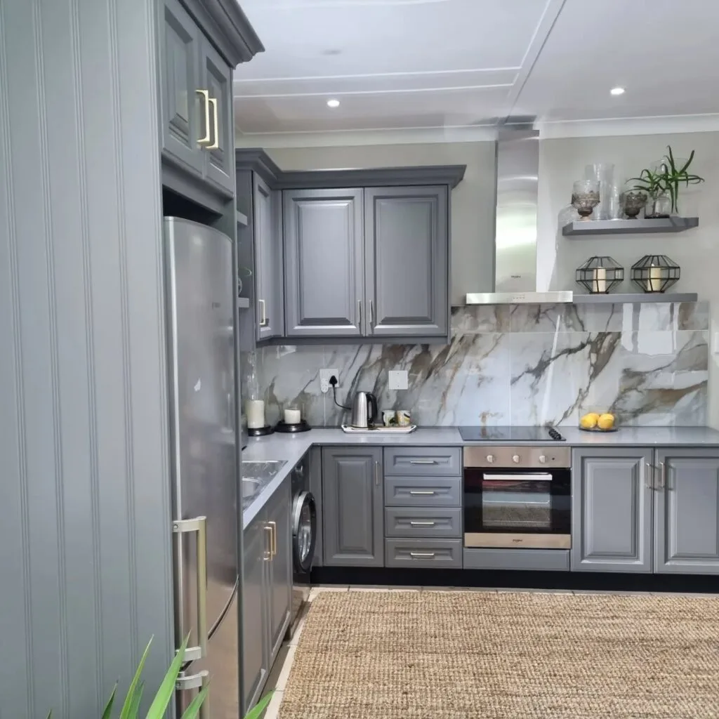 This kitchen showcases elegant gray cabinetry with raised-panel detailing that adds depth and character. The cool gray tone is refined and modern, enhanced by sleek silver hardware for a polished finish.