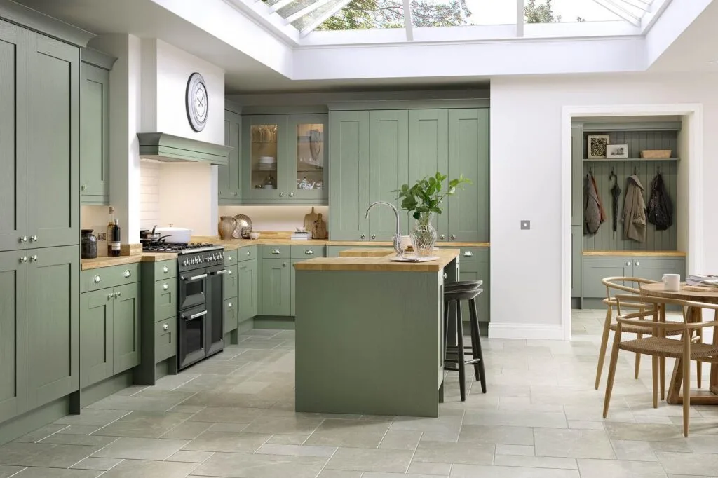 This beautiful kitchen features classic shaker cabinets in a soft sage green, offering a fresh and earthy feel. Paired with warm butcher block countertops and pale stone flooring, the space feels grounded and naturally bright.