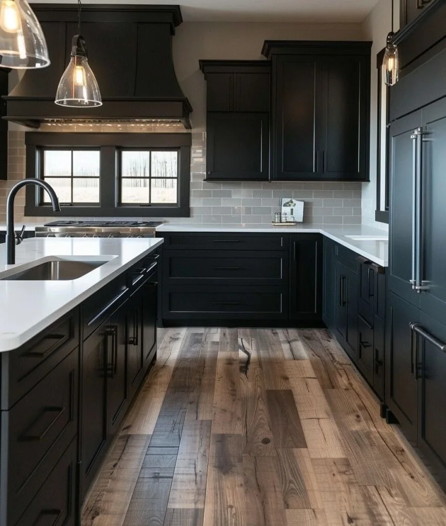 Chrome hardware and industrial-style pendant lights enhance the space with a touch of sleek modernity. The natural wood flooring softens the overall mood, keeping the kitchen inviting and balanced. This color choice is ideal for those seeking a bold, elegant design that feels both contemporary and timeless, perfect for open-plan spaces where the kitchen becomes a standout feature.