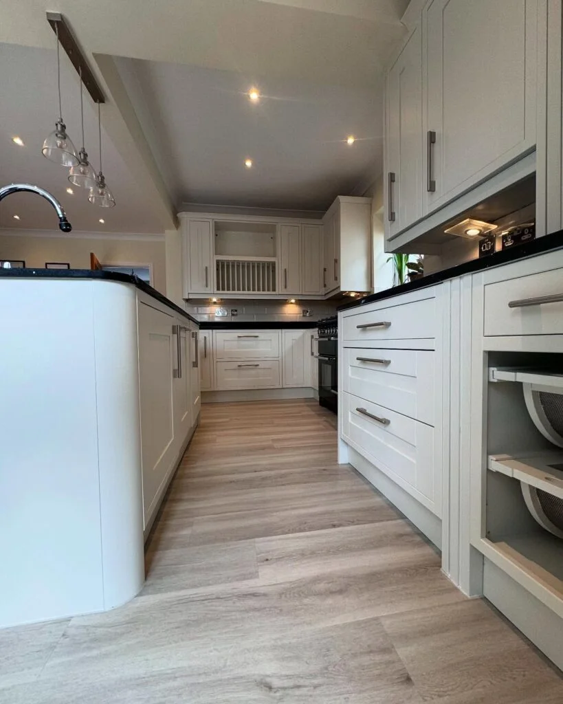 Modern pendant lighting and under-cabinet spotlights enhance both functionality and ambiance. Clever storage features like pull-out baskets keep things practical while maintaining a polished finish. With its neutral palette and smart layout, this kitchen is perfect for those who love a bright, contemporary space with just the right amount of warmth and elegance.