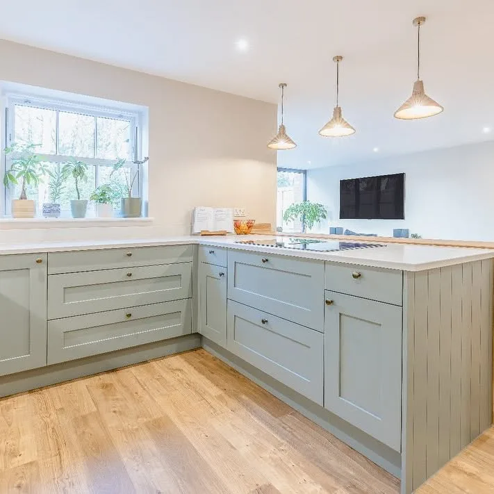 Simple brass knobs add a hint of vintage charm, while shaker-style fronts keep the design timeless. Natural light from the window enhances the peaceful palette, and the minimalist pendant lights add a modern touch. Perfect for those who love a calming, nature-inspired color scheme that feels both classic and contemporary in an open-plan setting.