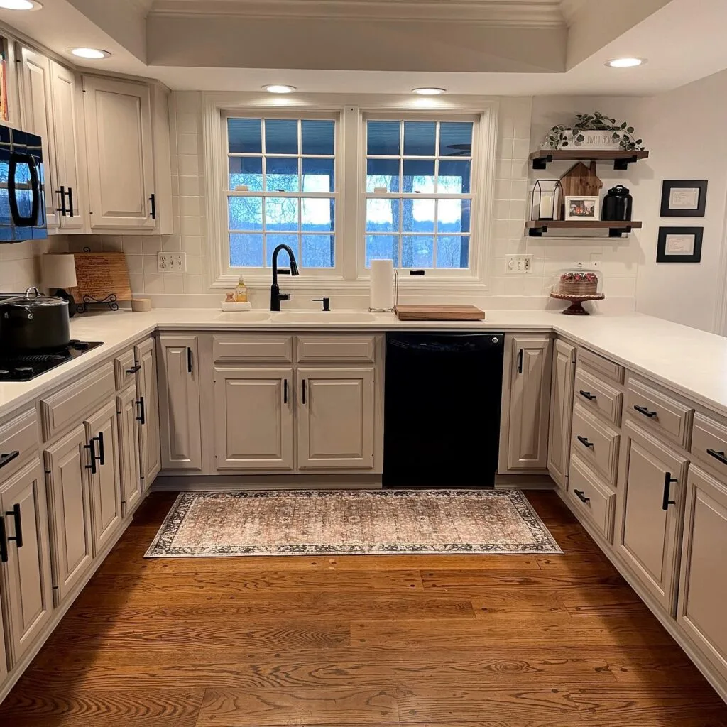This kitchen features soft taupe cabinets that offer a sophisticated and neutral base, blending beautifully with the warm wood floors. The black hardware and appliances add modern contrast, while the white countertops and backsplash keep the space feeling light and crisp.