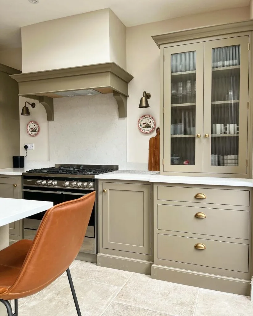 This kitchen features cabinets in a beautiful greige—an elegant blend of gray and beige—that creates a soft, welcoming tone. The color choice adds warmth without feeling too dark or too light, making it incredibly versatile.