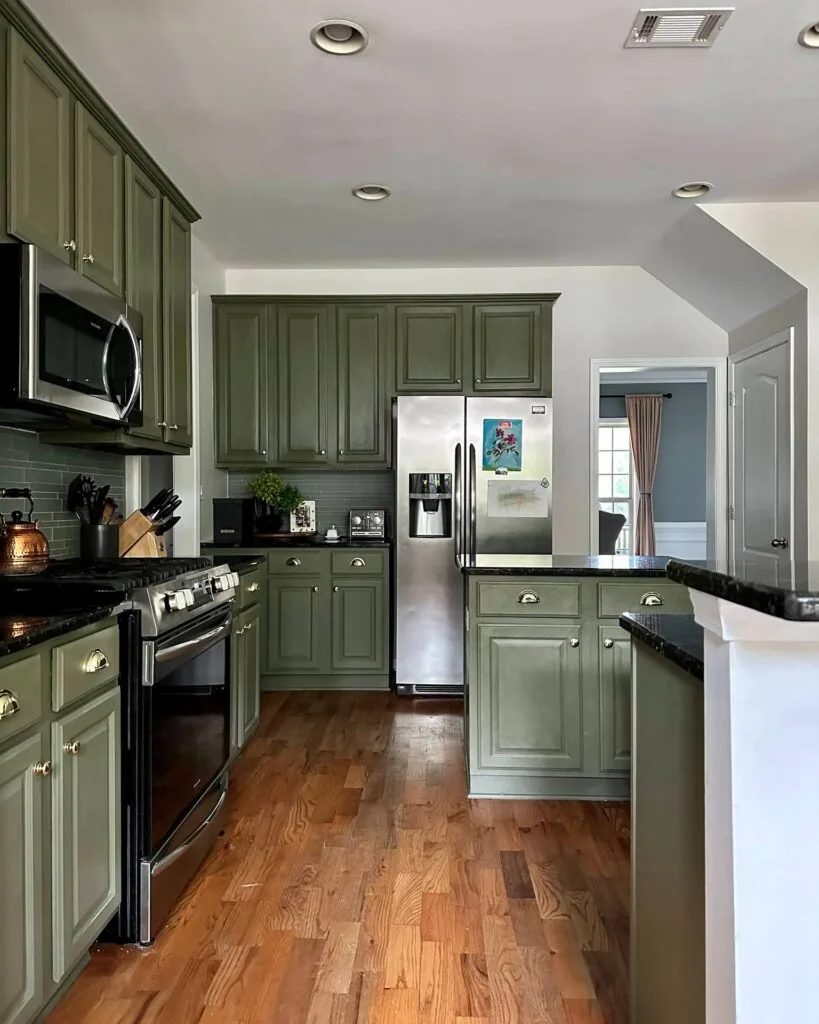 Paired with dark countertops and a sleek glass tile backsplash in a similar tone, the look is both cohesive and inviting. Stainless steel appliances and mixed metal hardware add modern functionality without clashing. Natural wood floors soften the deeper tones, tying the whole palette together. This design is perfect for anyone wanting a calm, earthy kitchen with both character and comfort.