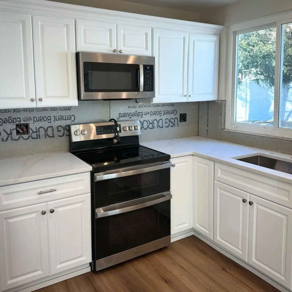 Warm wood floors add contrast and warmth to the bright palette. Though the backsplash is still in progress, the overall design already feels open, fresh, and modern. With ample natural light from the large window and sleek stainless steel appliances, this space is ideal for those who love a bright, airy kitchen with long-lasting appeal.