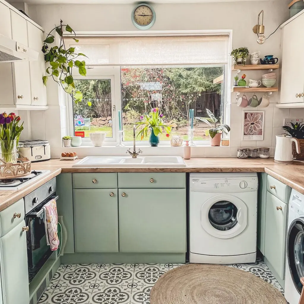 Patterned floor tiles add a bold, decorative touch that anchors the space, while the large window invites in natural light and garden views. The cozy layout and charming details like hanging mugs, tulips, and teacups make the room feel personal and welcoming. Perfect for those who love nostalgic, cottage-core style with a modern twist that feels fresh and homey.