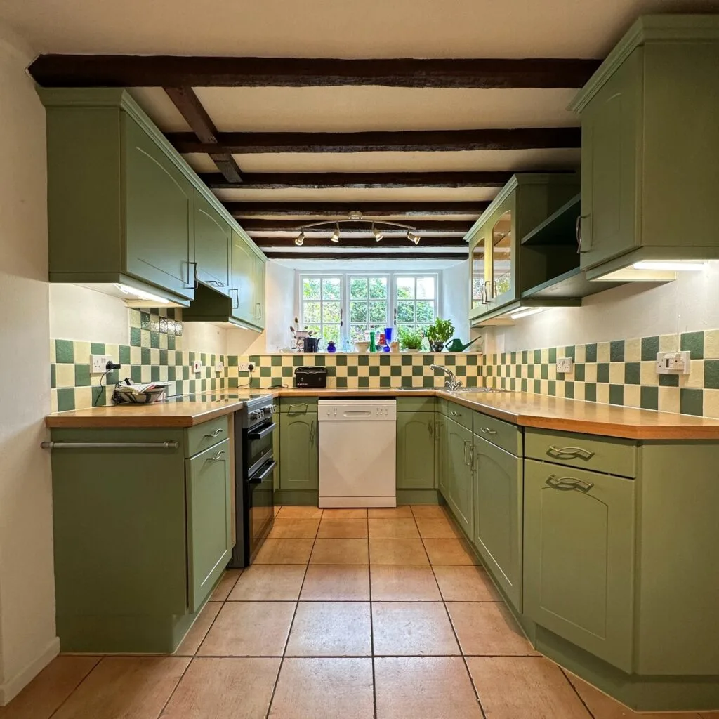 Exposed ceiling beams enhance the rustic cottage vibe, while terracotta floor tiles ground the space with natural warmth. The soft sage cabinetry blends beautifully with the garden view outside the window, creating a space that feels both cozy and connected to nature. Perfect for those who love traditional details and a relaxed, welcoming kitchen with timeless personality.