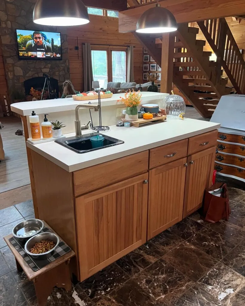 The beaded cabinet doors add a classic country touch, while open counter space allows for seasonal decor and easy-access essentials. A charming bonus is the pet feeding station neatly placed at the end, showing thoughtful design for furry companions. Surrounded by wood-paneled walls and a stone fireplace, this island blends comfort and function in a lived-in space.
