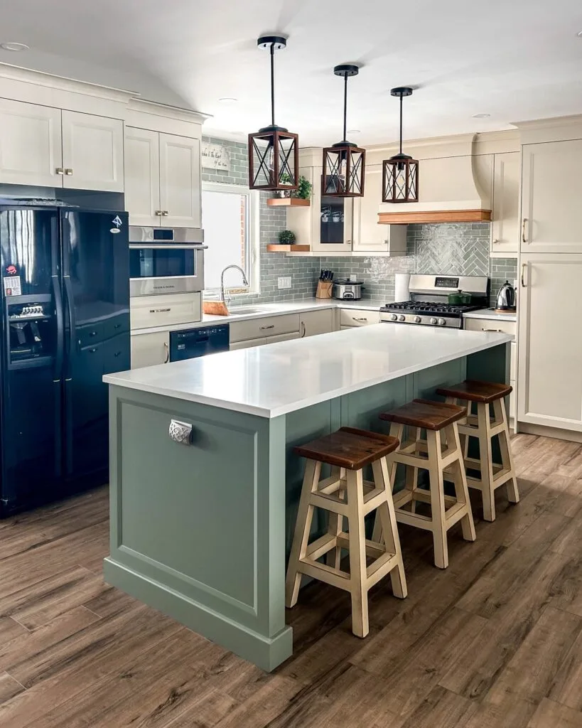 This charming kitchen island features a soothing sage green base paired with a clean white quartz countertop, striking a perfect balance between color and calm. The soft green brings a refreshing touch to the otherwise neutral kitchen, while the panel detailing adds a timeless, cottage-inspired look.