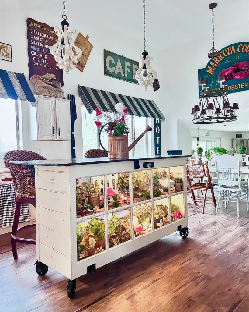 This one-of-a-kind kitchen island brings playful charm and creativity into the heart of the home. Set on wheels for mobility, the island features a unique glass-front display filled with miniature plants, fairy garden décor, and whimsical accents.