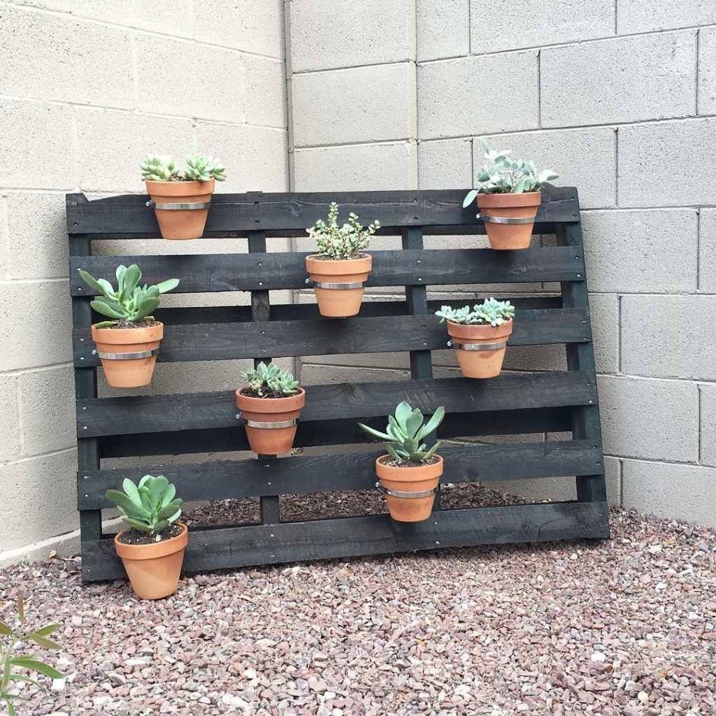 This pallet garden uses a painted black pallet as a backdrop for small terracotta pots filled with succulents.