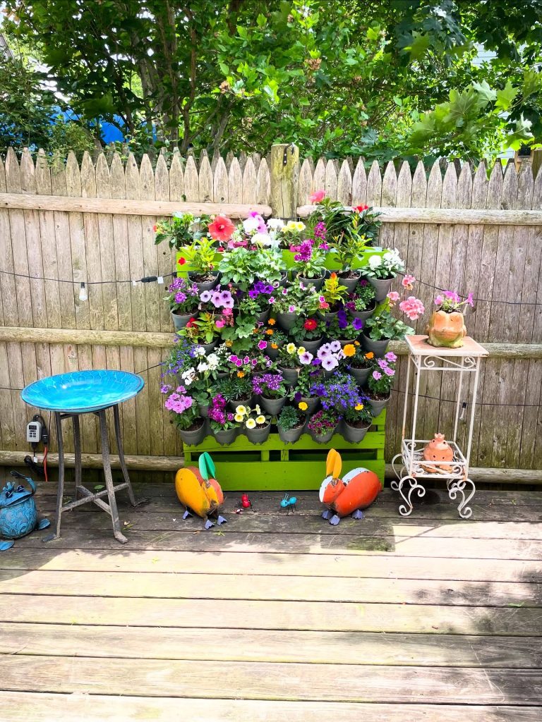 The vertical setup keeps plants organized while saving floor space on the wooden deck. Placing the pallet against the fence creates a strong backdrop that highlights the flowers and greenery.