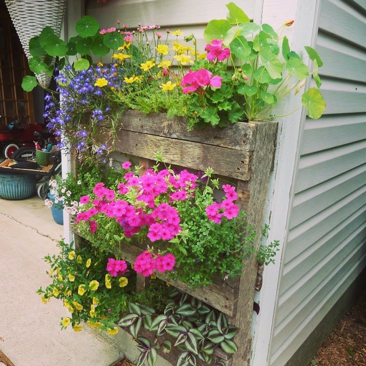 This pallet garden fits neatly into a corner beside the house and turns a narrow space into a vertical flower display.