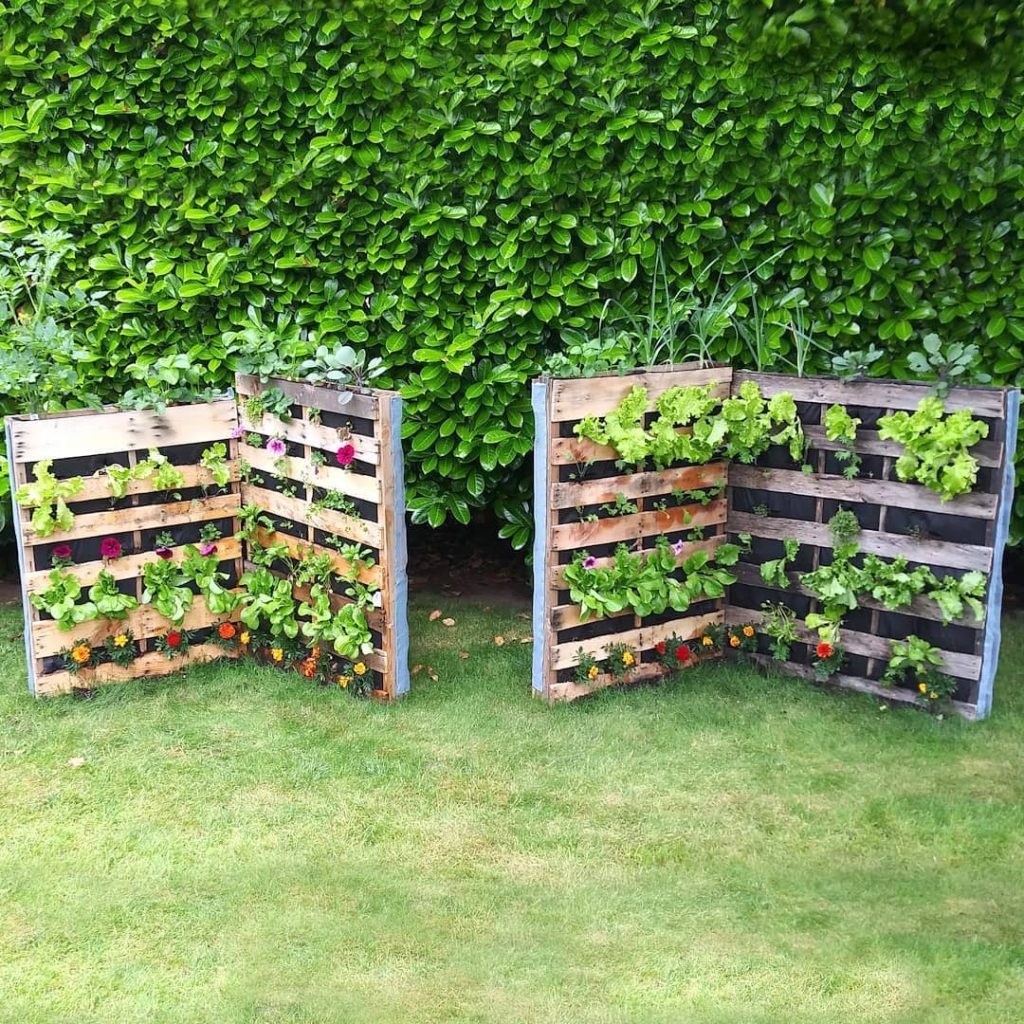 This pallet garden uses two wooden pallet panels arranged in a corner shape to create a compact vertical planting space.