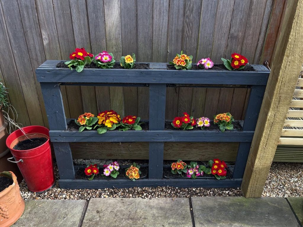 This pallet garden turns a simple wooden pallet into a vertical planting wall filled with flowers and greenery, creating a layered garden feature against the fence.