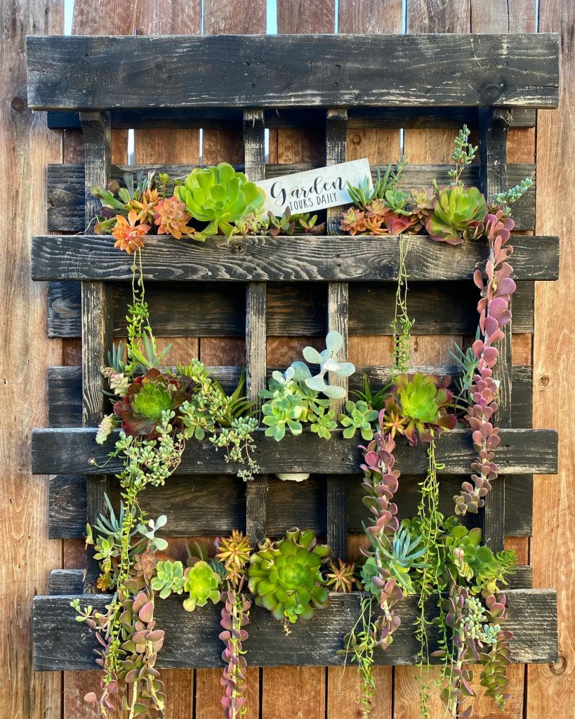 This pallet garden turns a dark stained pallet into a vertical display filled with colorful succulents.
