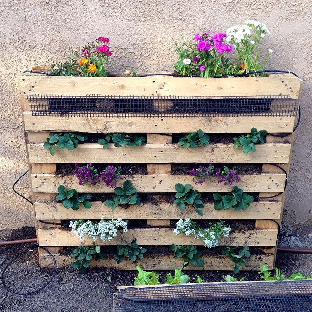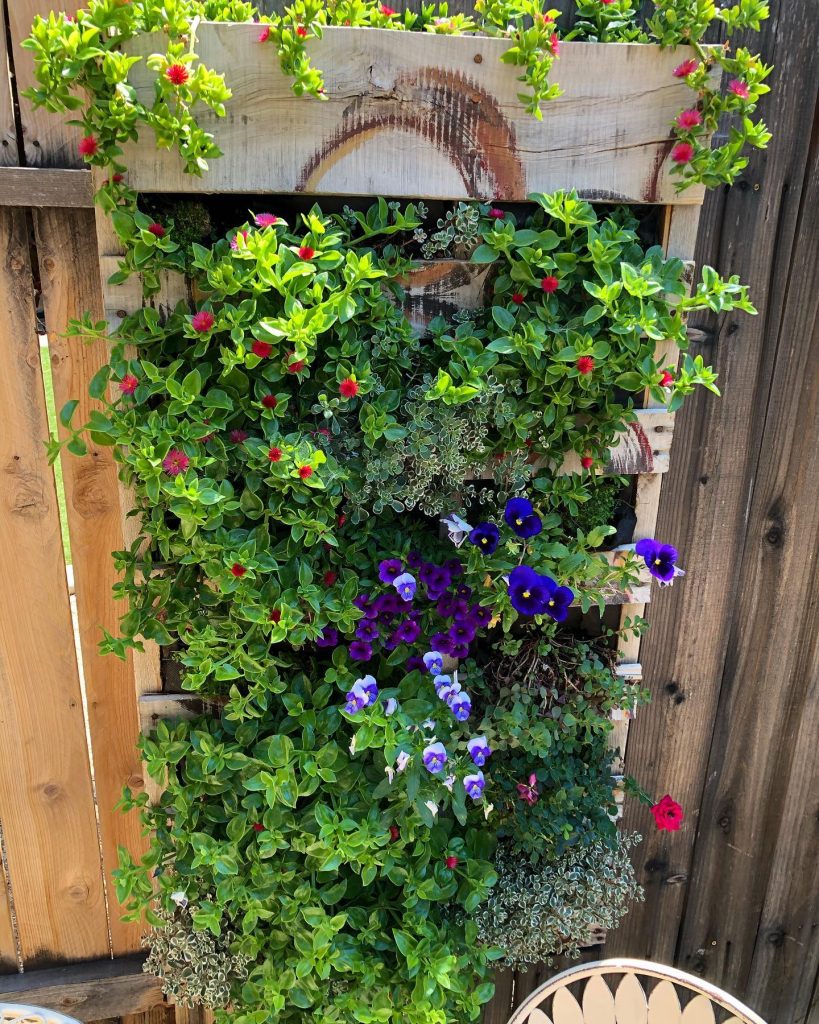 Soil fills the pallet openings and supports layers of leafy plants, trailing vines, and colorful blooms.