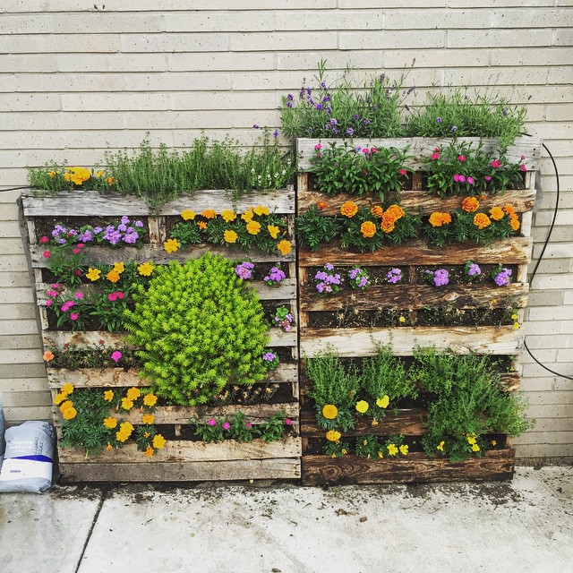 Soil fills the pallet openings and supports rows of flowers, herbs, and leafy plants.