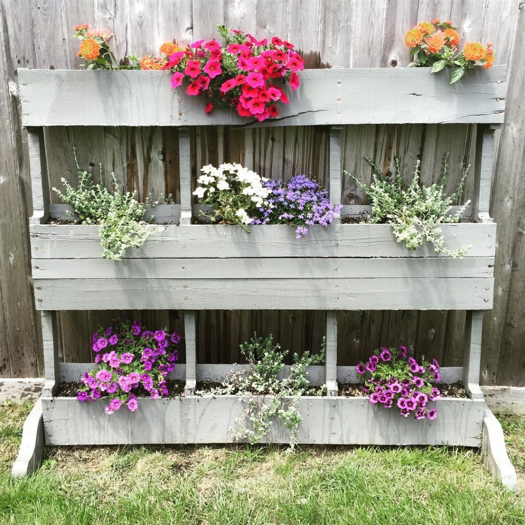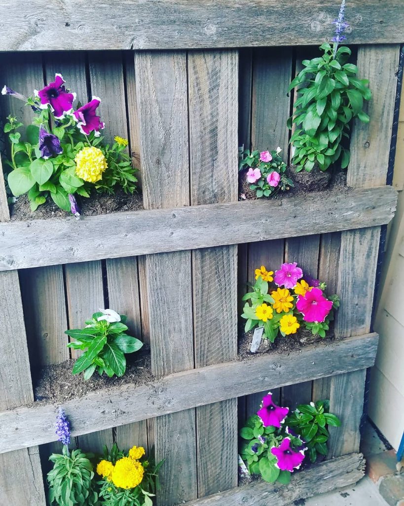 Placing the pallet against the fence helps support the structure and turns a narrow space into a compact flower garden.