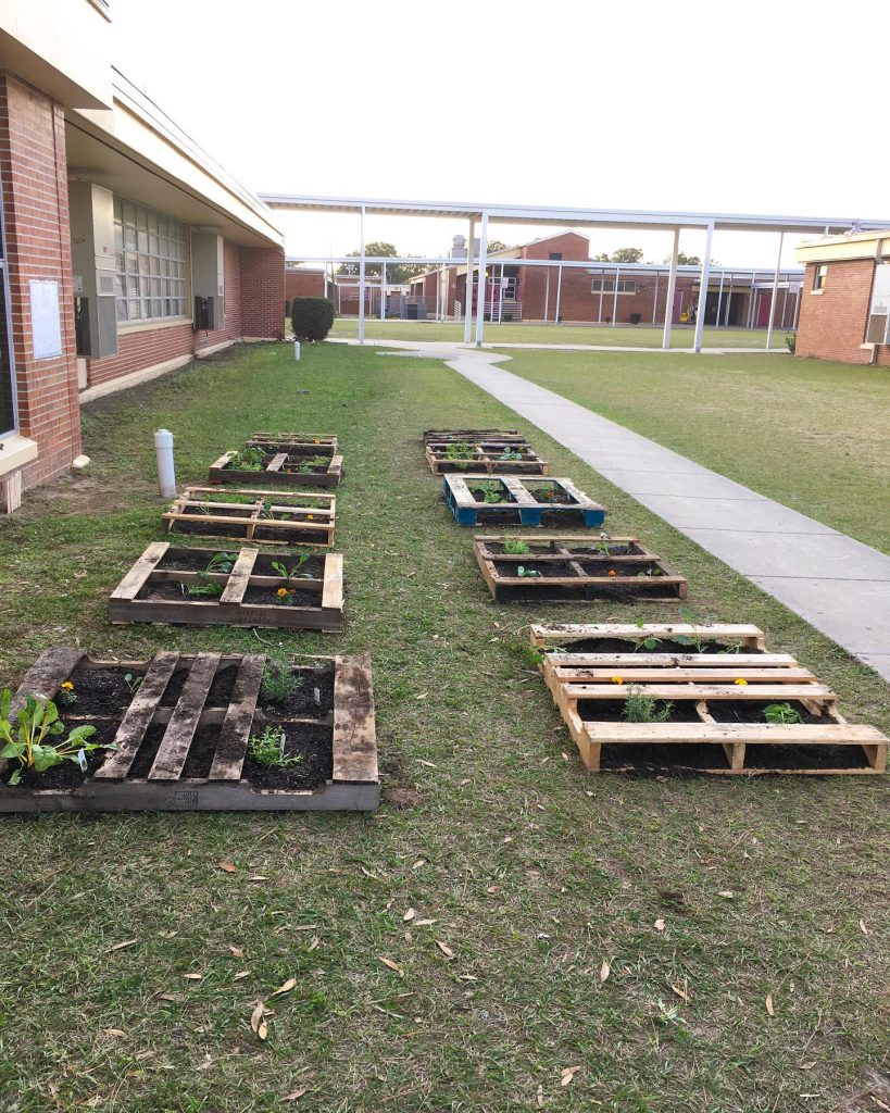 This pallet garden uses several wooden pallets laid flat on the ground to create simple planting beds across the lawn.