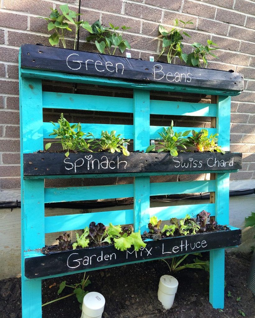 This pallet garden uses a painted wooden pallet to grow vegetables in clearly labeled planting rows.